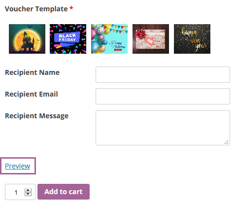 On the frontend of product page the product voucher options will be shown, for instance a Recipient Name, Recipient Email, Recipient Message options might look like this:
