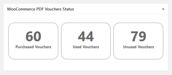The WooCommerce PDF Vouchers Status widget gives you a quick overview of Purchased, Used and Unused Voucher Codes in your store. You can go to Purchased, Used or Unused Voucher Codes tab by clicking on the respective box.