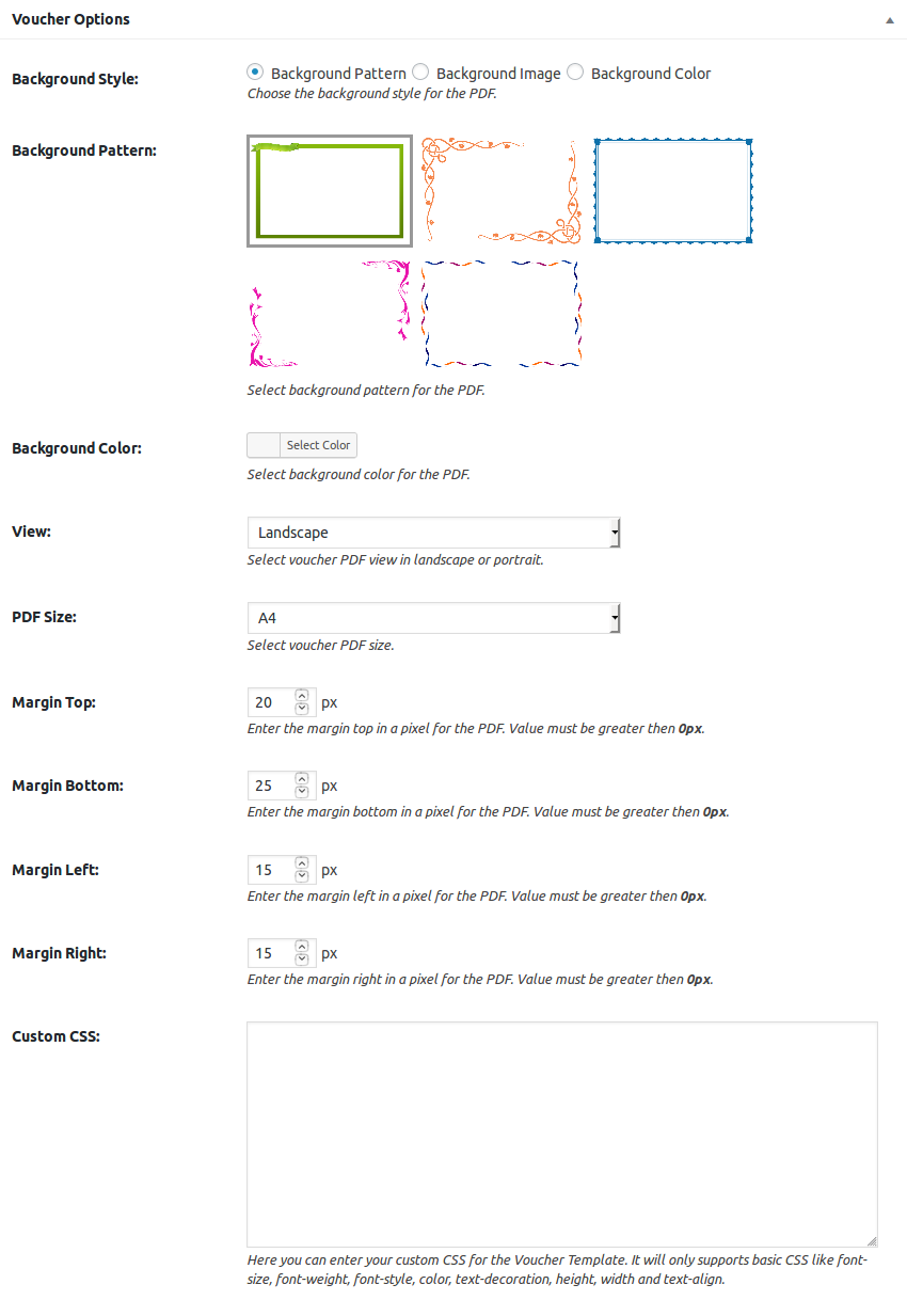 If you would like to customize some aspect of the styling of the Pdf Voucher plugin you can enter those style rules here. Note, it is not required to enter in custom styles into this section, it is provided as a convenience so you do not have to modify your theme to make a few simple adjustments.