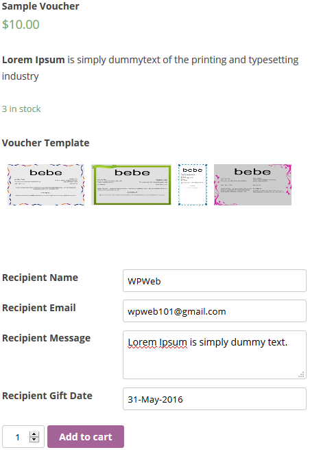 Demo: http://demo.wpweb.co.in/woocommerce-pdf-vouchers/product/gift-voucher-simple/
