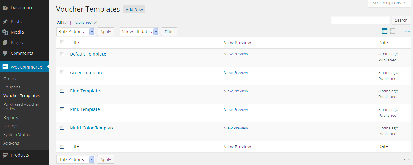 You can easily duplicate any Voucher Template you created with just one click. After clicking on the "Duplicate" link, the plugin will create a draft of the chosen Voucher Template, including all content and settings.
