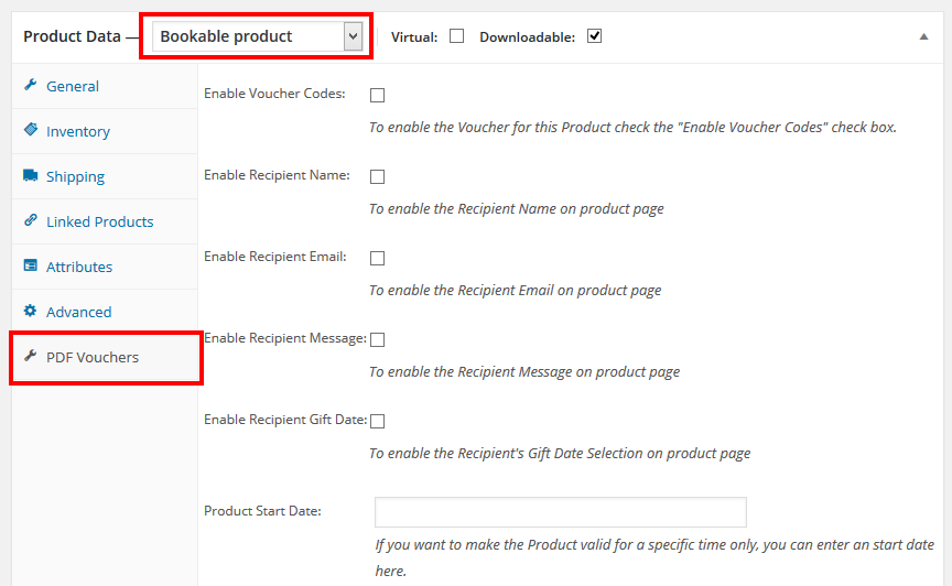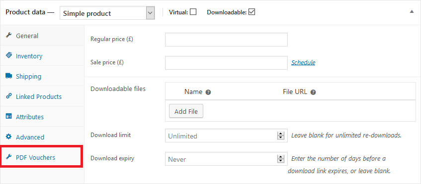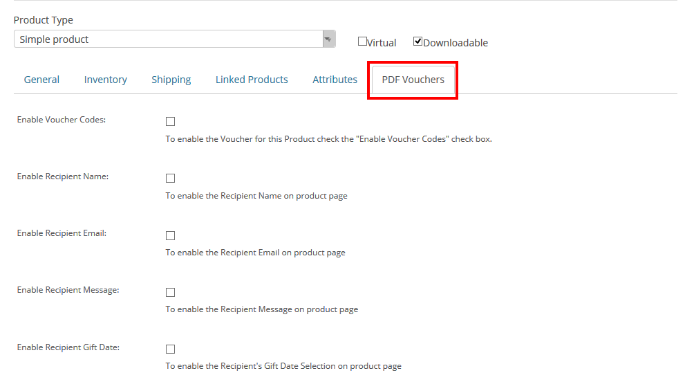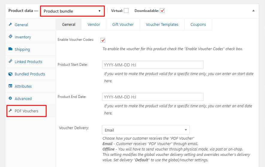Check this box if you want to integrate WC Vendors with PDF Vouchers. Enabling this option will allow WC Vendor's vendor user to add PDF Voucher to any product on product add/edit page as shown in screenshot below :-