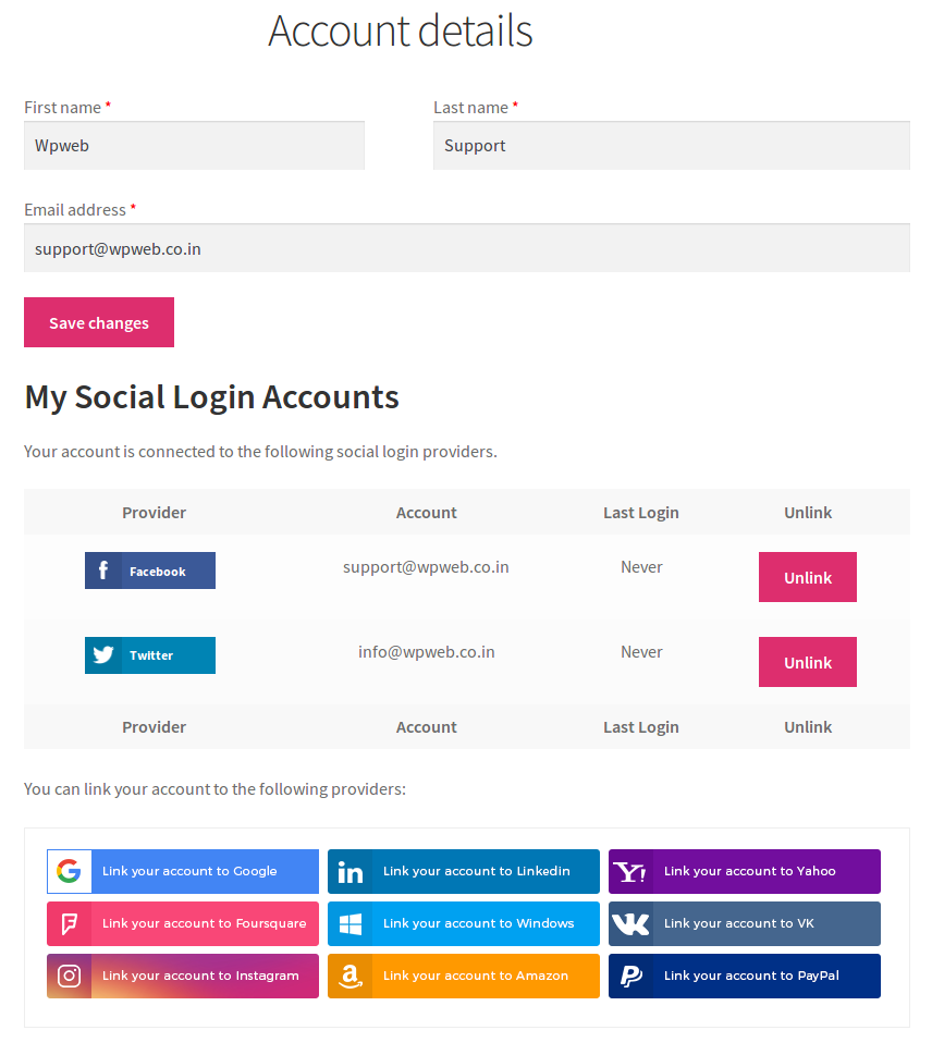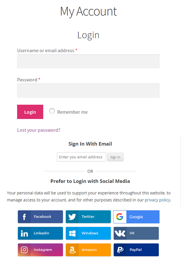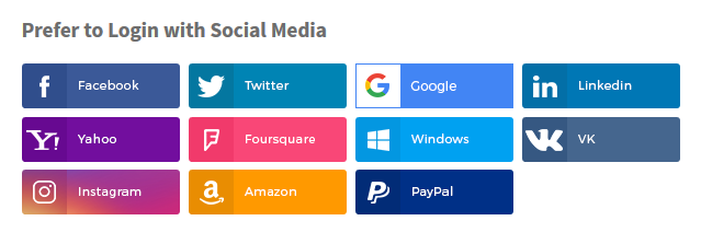 WooCommerce Social Login extension allows users to login and checkout with social networks such as Facebook, Twitter, Google, Yahoo, LinkedIn, Foursquare, Windows Live, VK.com, Instagram, Amazon PayPal and login with Email.