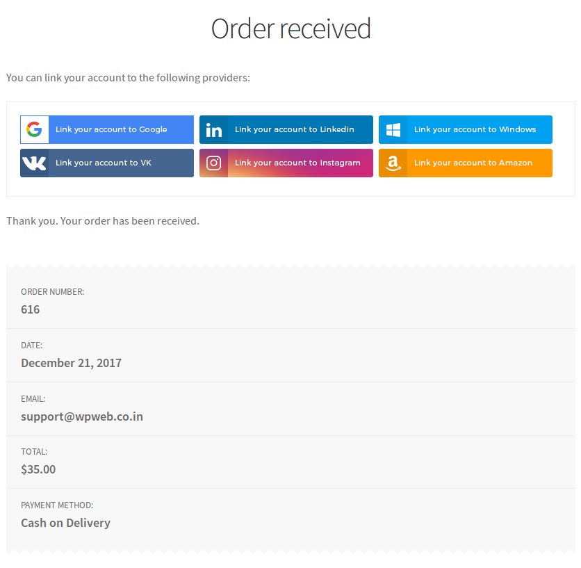 You can even invite logged in users to link their accounts after checkout for faster purchase in the future. Simply enable Social login buttons on the Thank You page.