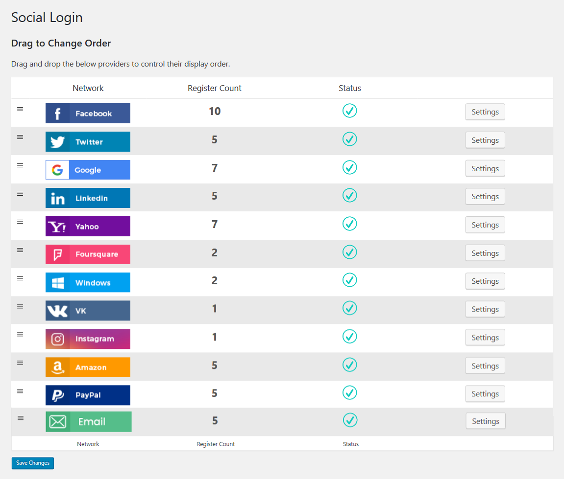 Admin can change the order of social networks buttons by drag and drop interface and view number of sign-ups for each social network as shown in the image below.