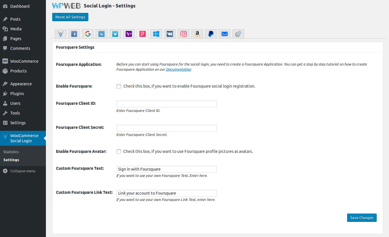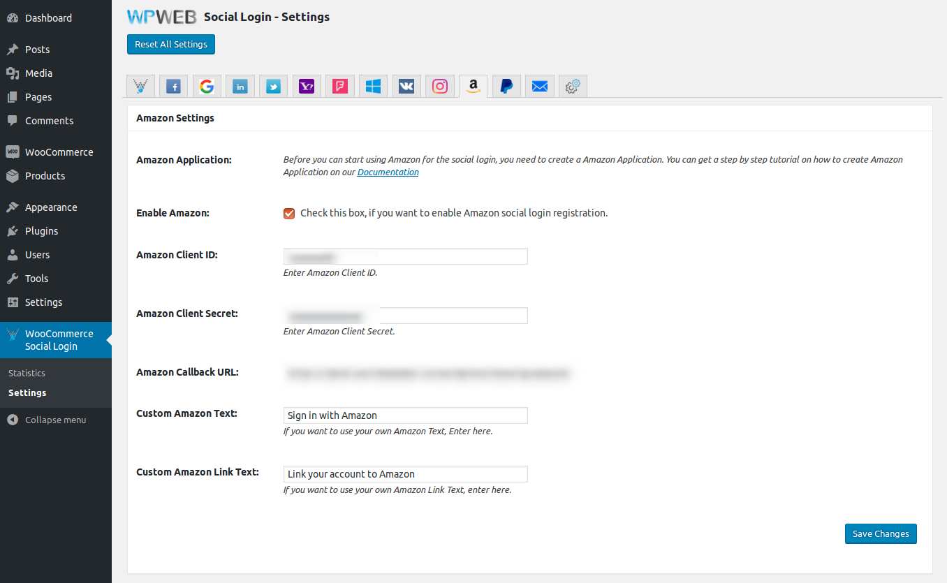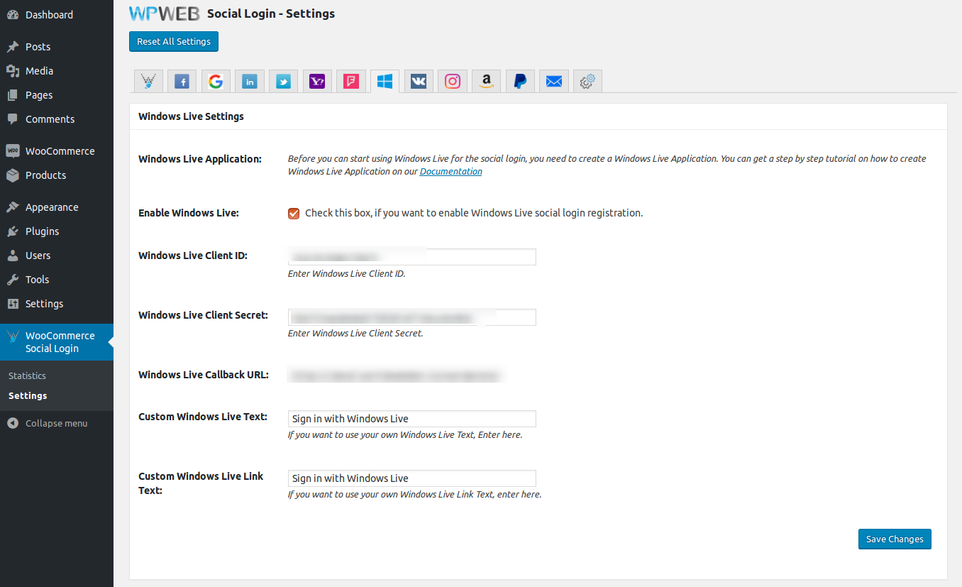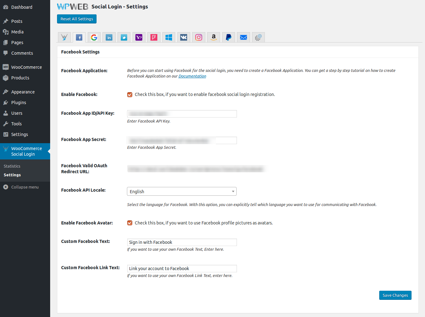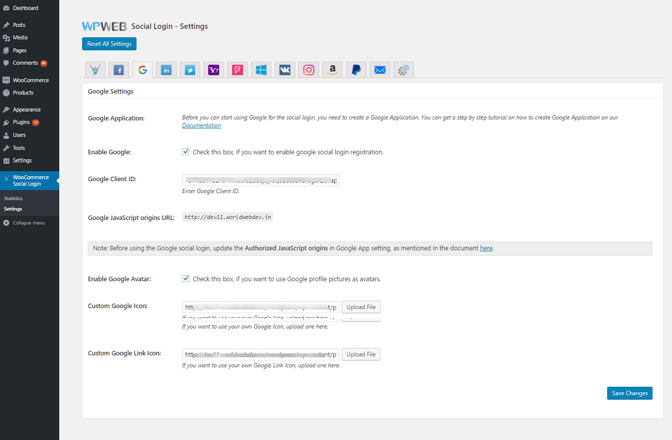 Click on the social login icon and you will be able to see the custom settings as shown in the image below.