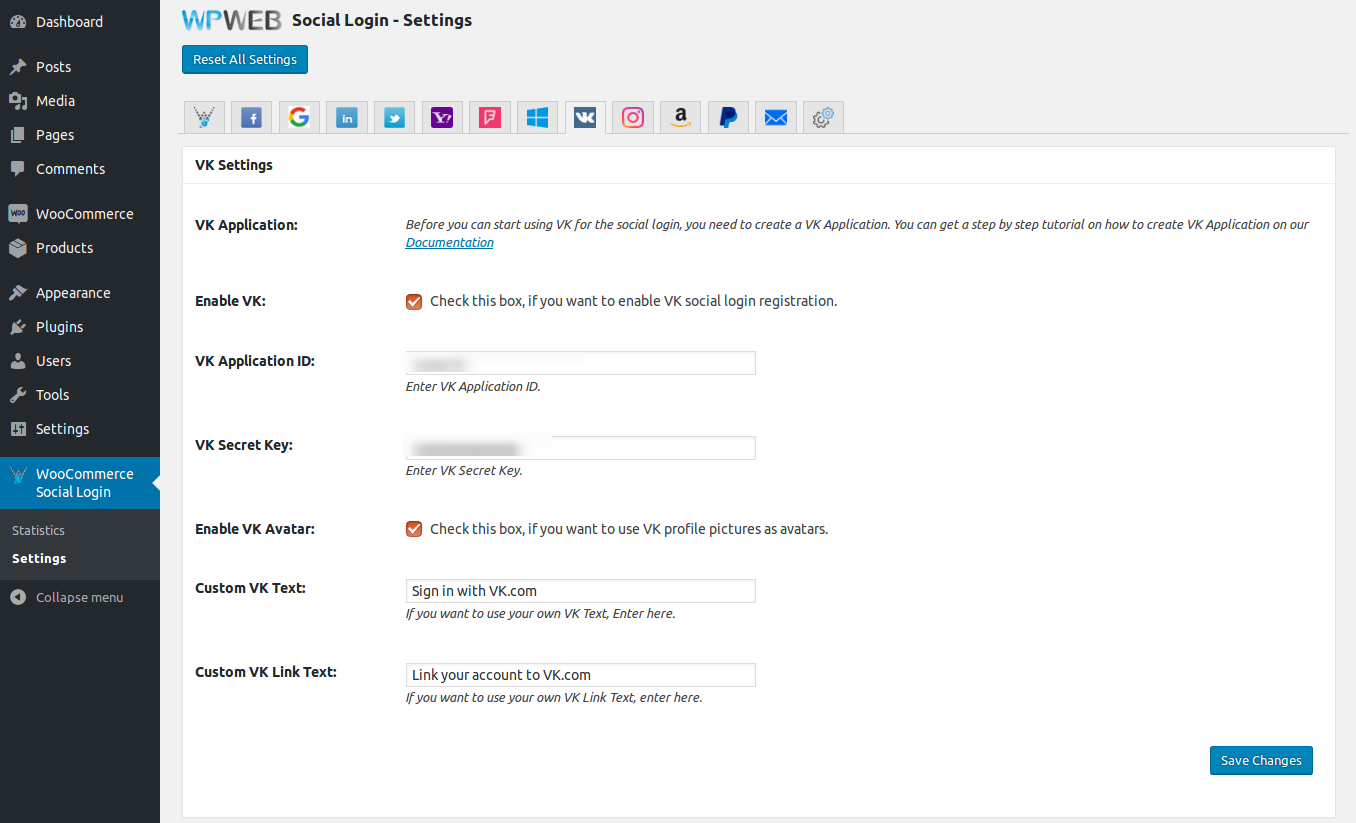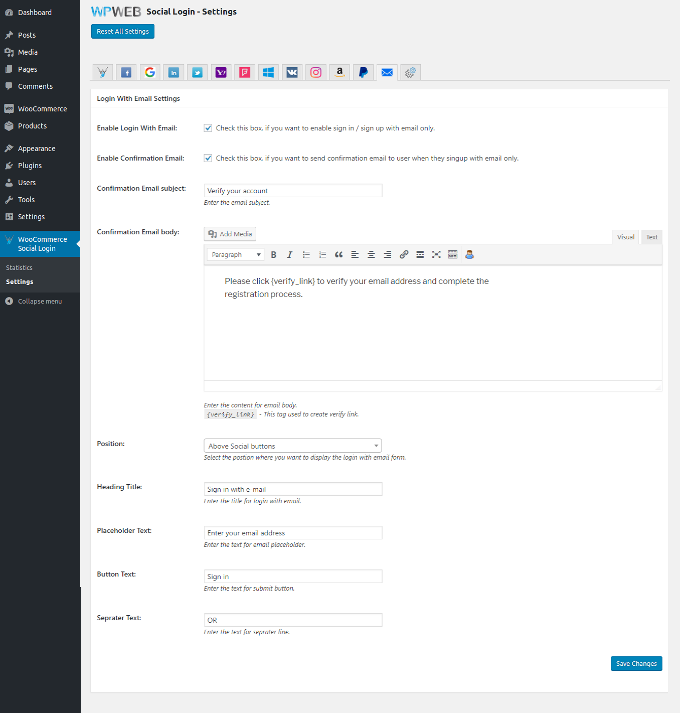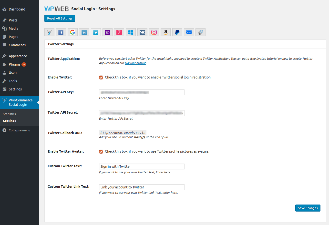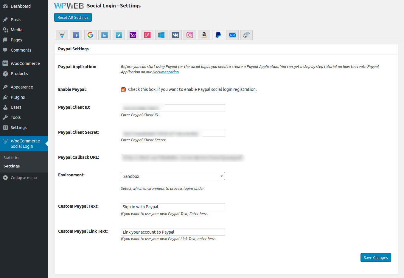 Click on the social login icon and you will be able to see the custom settings as shown in the image below.