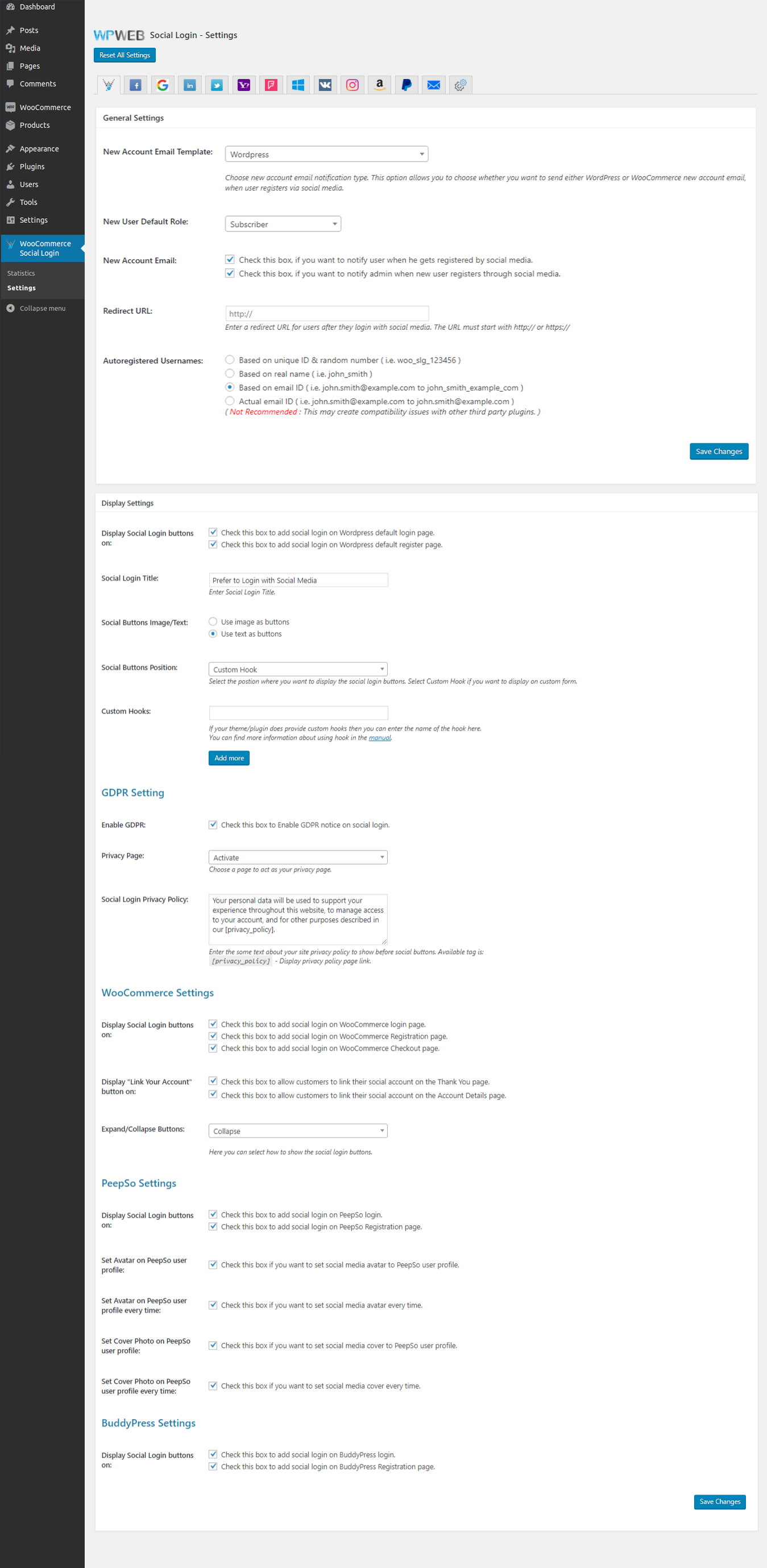 Click on the social login icon and a new window with the custom settings will pop up as shown in the image below.