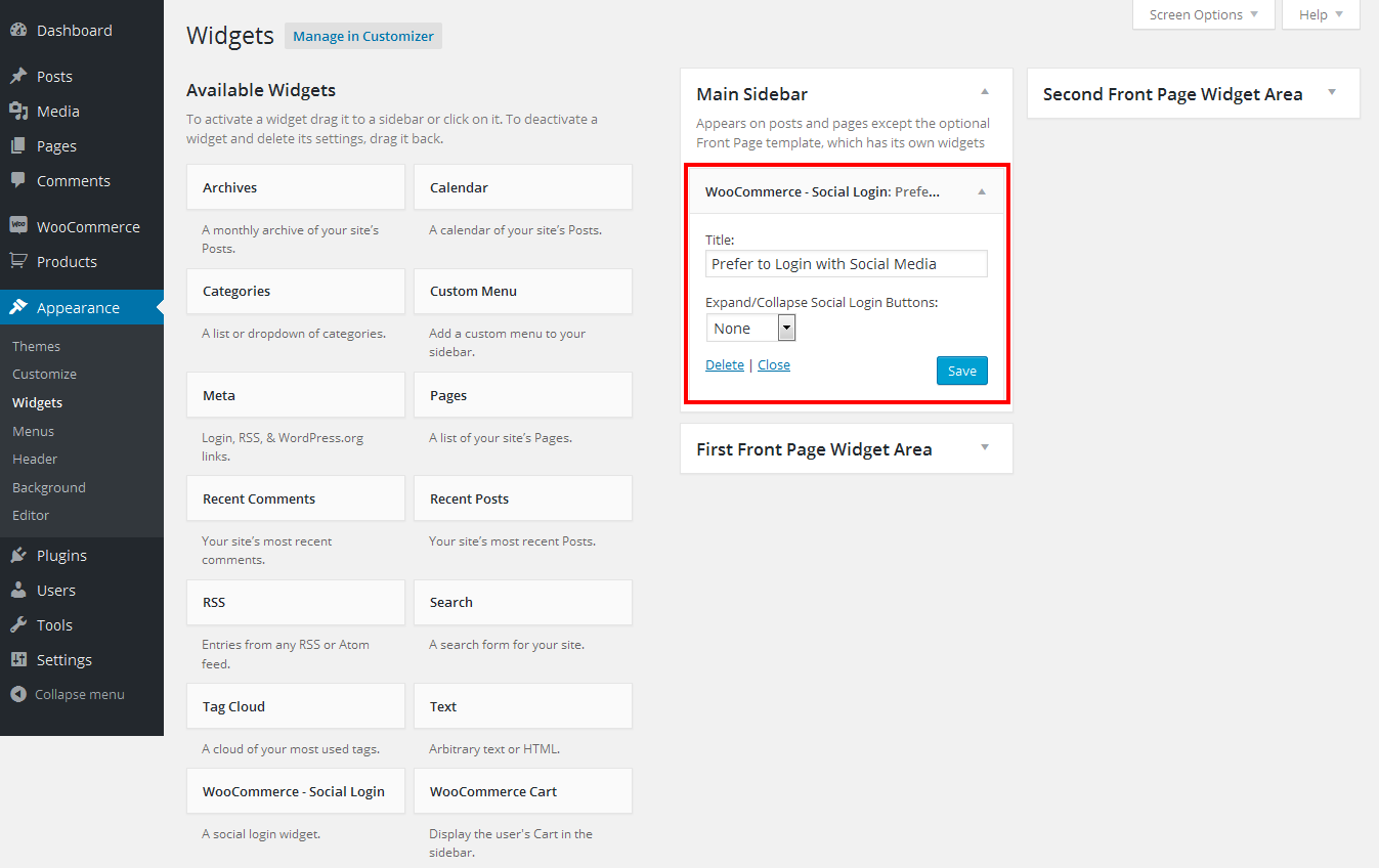 Find the "WooCommerce - Social Login" widget and drag it to your desired place. You can title your widget (this will appear above the social buttons).