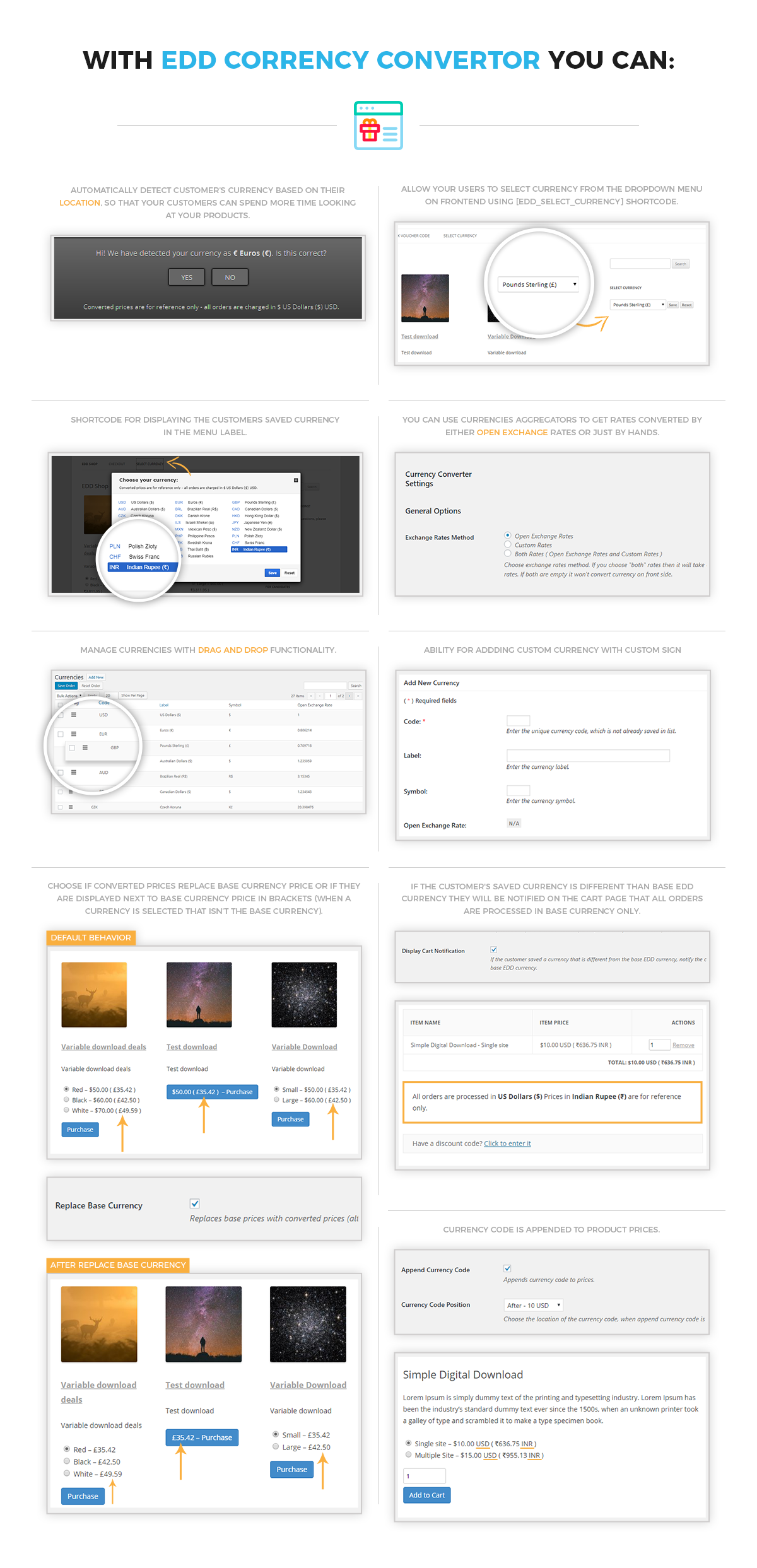 Easy Digital Downloads Currency Converter extension allow your customers to convert product prices to a currency of their choice easily.