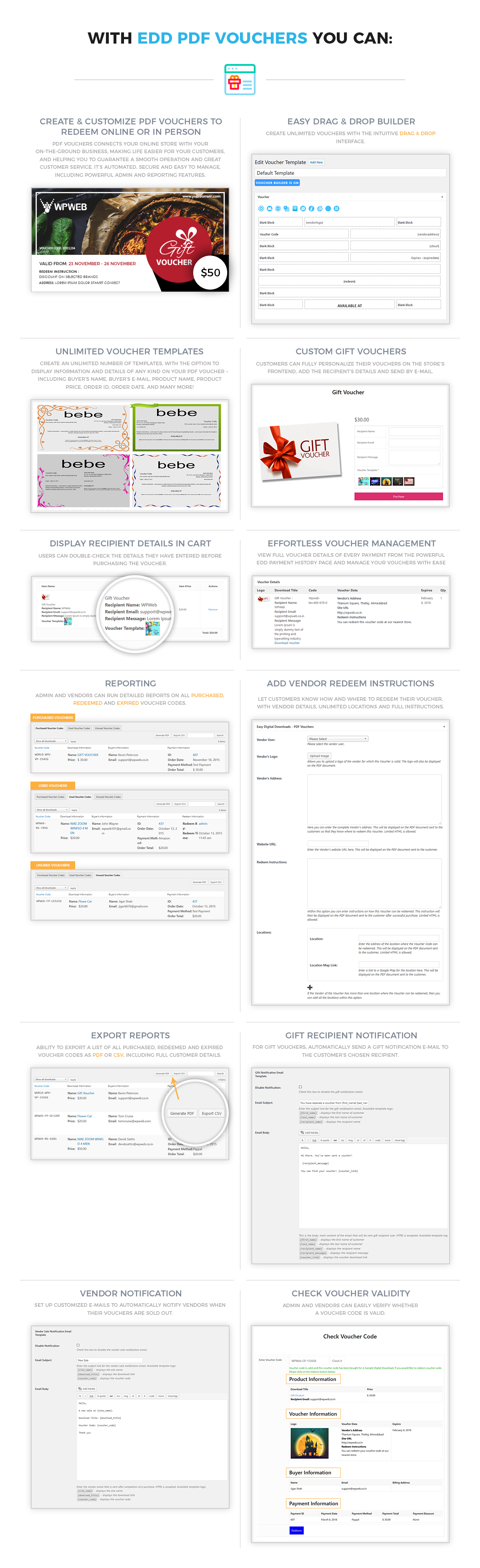 Easy Digital Downloads PDF Vouchers allows you to sell voucher codes that can then be redeemed at a physical location. This is perfect for stores that wish to sell tickets to events, discount codes for on-site pickup, class admission tickets and more.