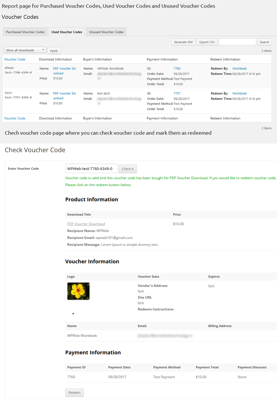 Report pages for purchased, used and unused voucher codes and also ability to check any voucher code is valid or not and mark them as redeemed