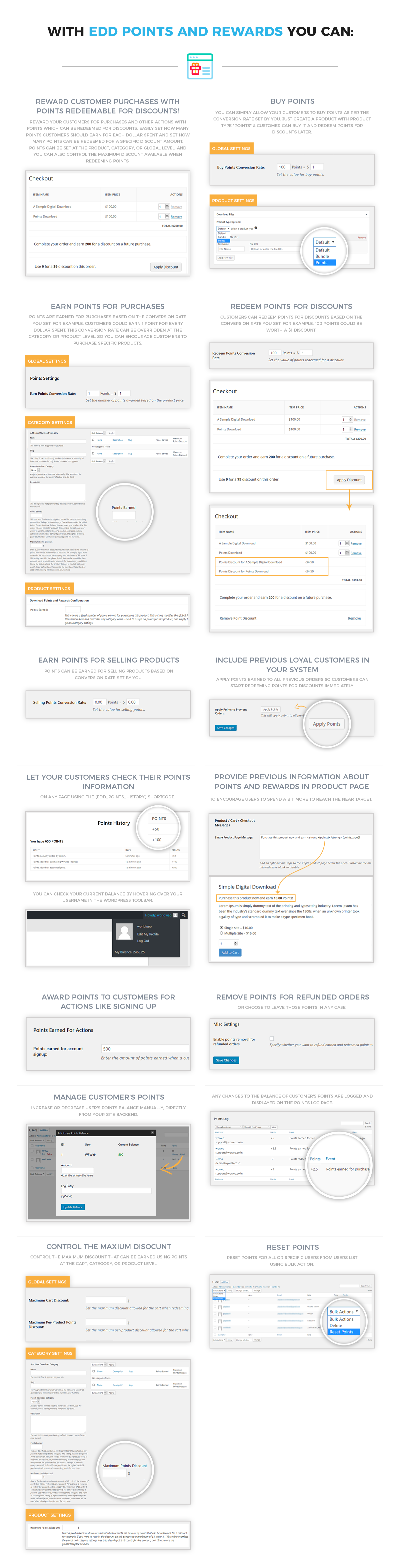 Easy Digital Download Points and Rewards extension allows you to reward your customers for purchases and other actions with points that can be redeemed for discounts on future purchases.