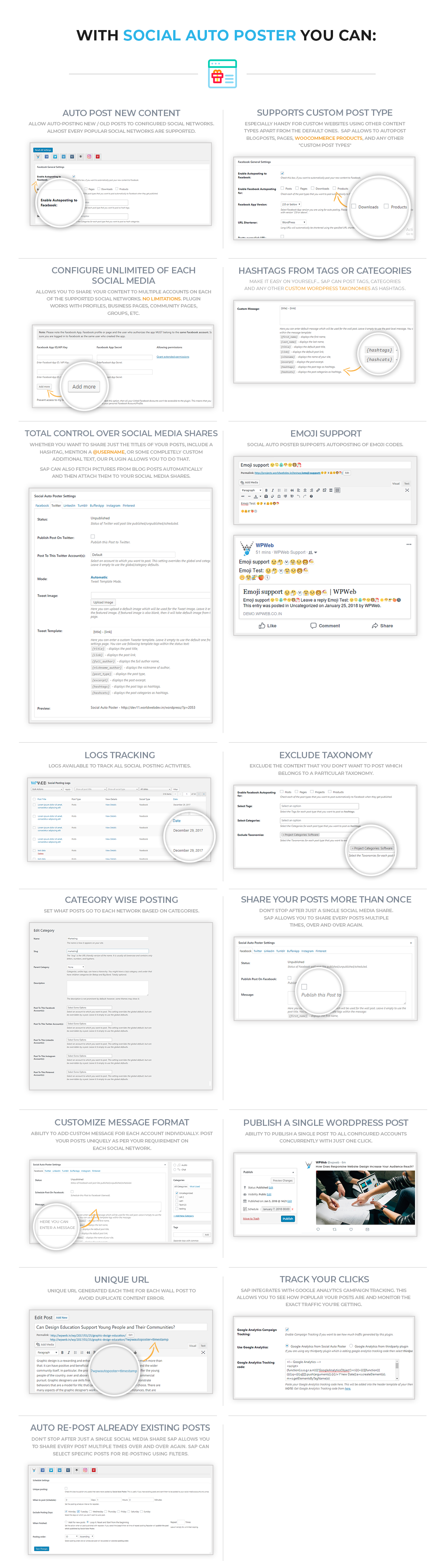 Social Auto Poster – A perfect choice for auto posting your content to famous social media platforms like Facebook, Twitter, LinkedIn, Tumblr, Buffer App, Instagram, and Pinterest. You can configure your social accounts and post new content as well as repost your old content to keep it alive and reach a maximum audience.