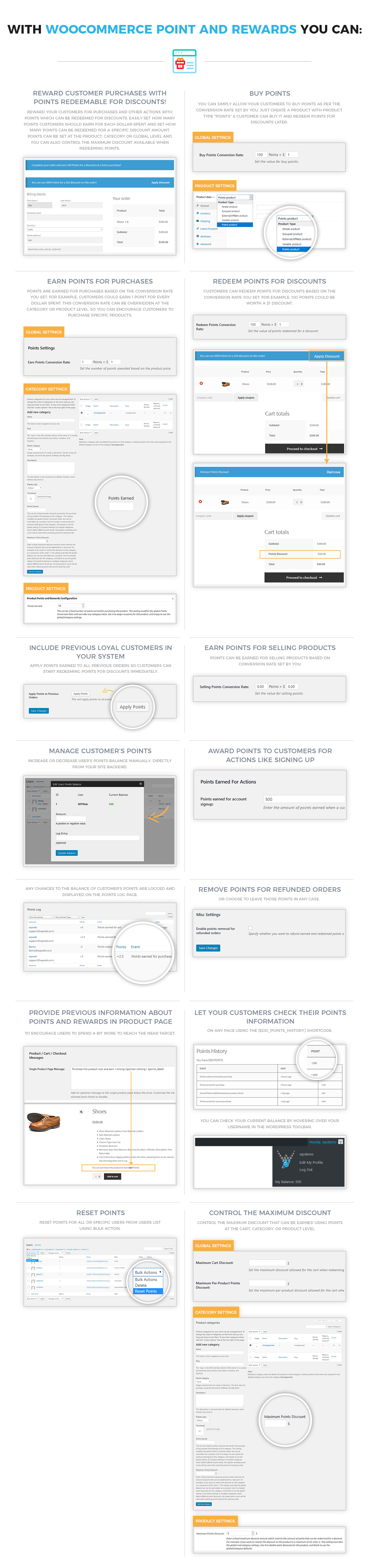 Using our WooCommerce Points and Rewards extension you can set how many reward points you want to set for a specific amount of purchases. You can set this threshold reward point per purchase as per your convenience i.e. for per product, category or globally. It gives you a control over the reward point/loyalty point management using WooCommerce Points and Rewards plugin.