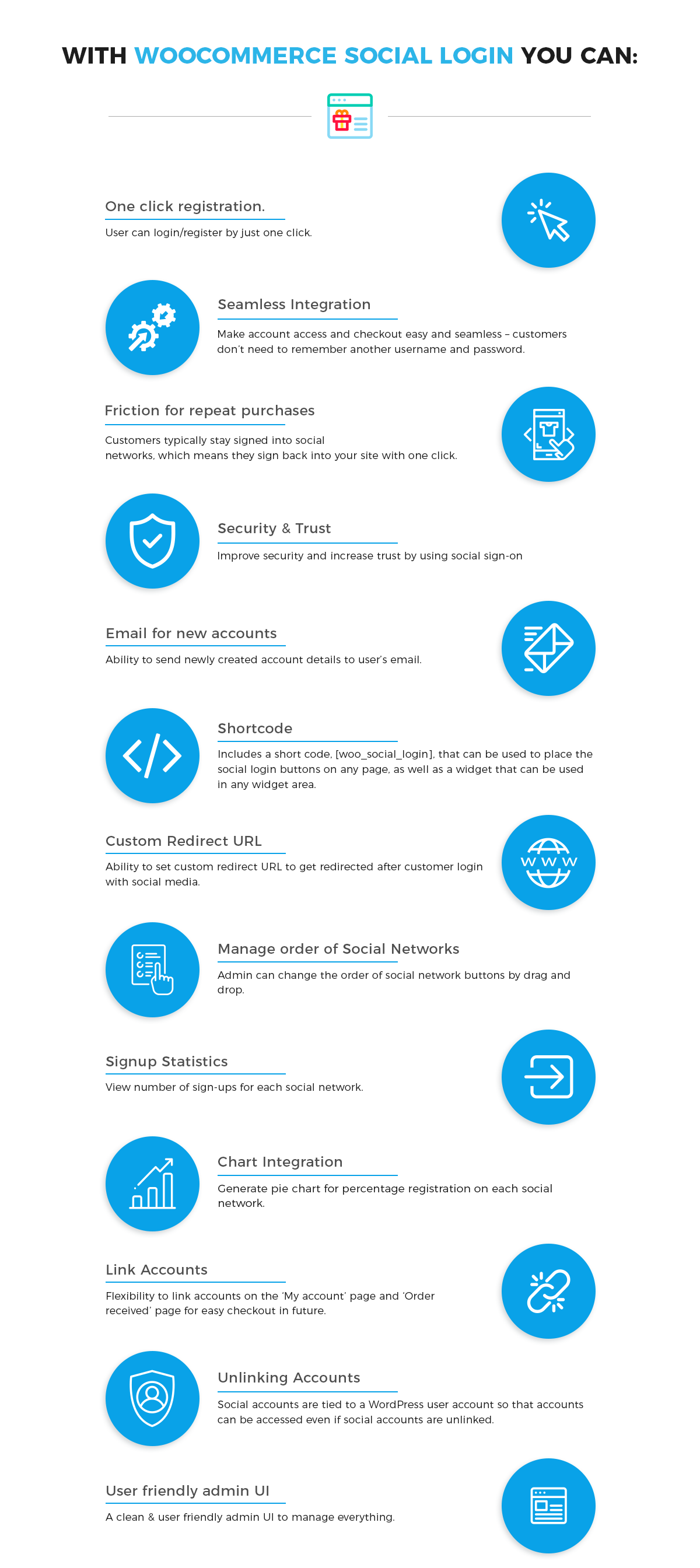 If you have a registration system on your e-commerce website, then it take too much time of user to checkout so user get bored of it and thus it will decrease your sale. But, If you use WooCommerce Social Login, then it save user’s time so it will increase your sale.